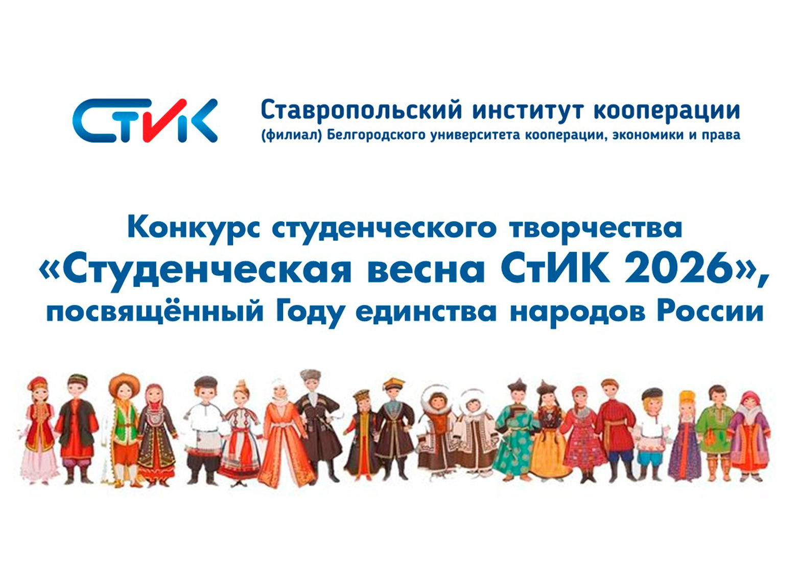 26 марта 2026 года в 16:10ч. в актовом зале института состоится конкурс студенческого творчества «Студенческая весна СтИК 2026», посвященный Году единства народов России.