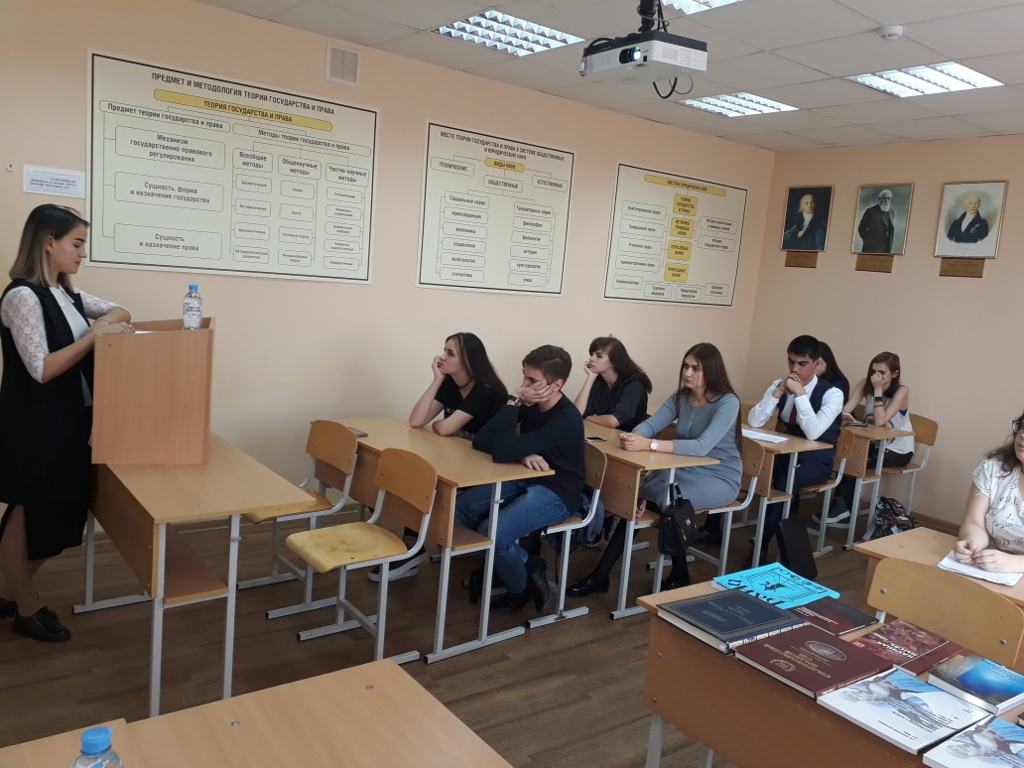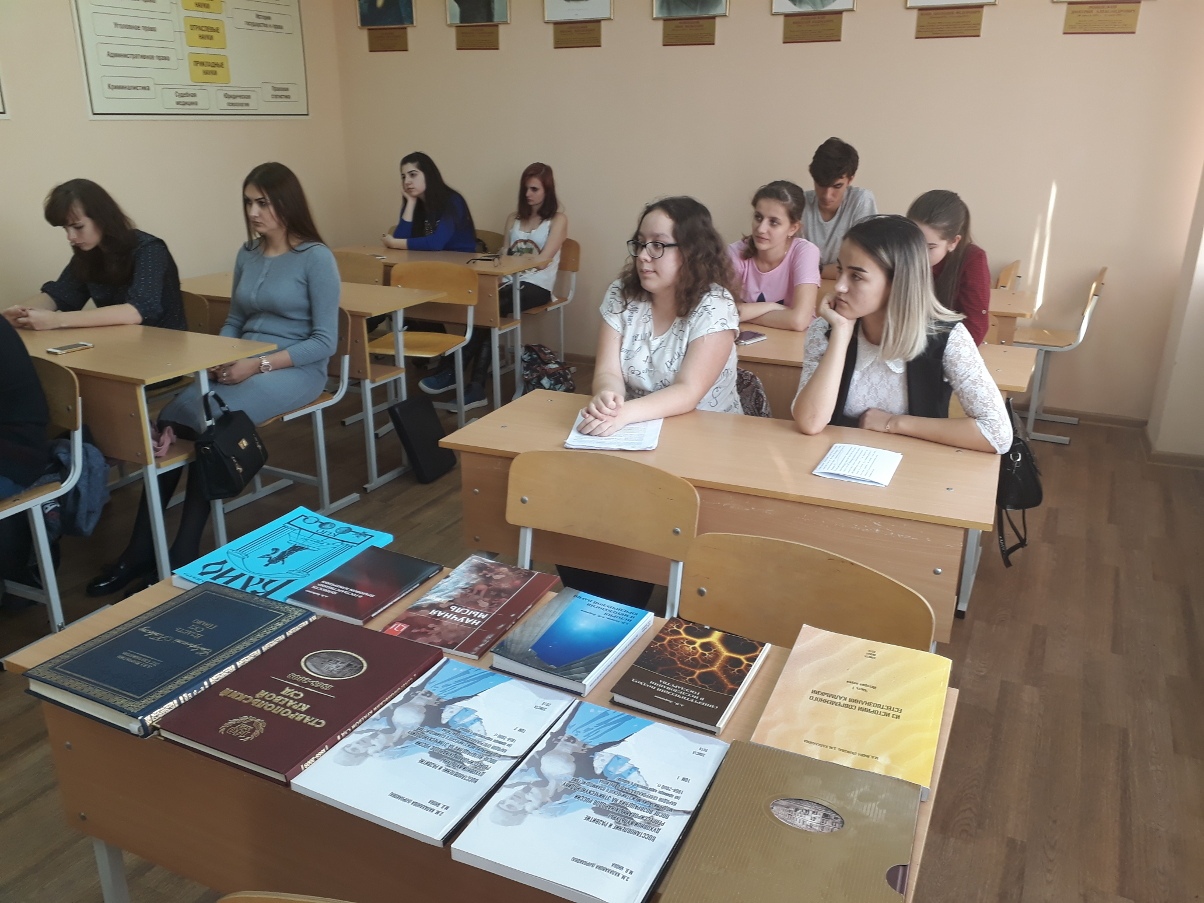 В целях передачи научного опыта была организована выставка научных трудов профессорско-преподавательского состава кафедры теории и истории государства и права. Куратор кружка доцент Калинина Е.В. предложила общее направление научной работы студентов в 2017-2018 учебном году — «Противодействие терроризму и экстремизму в молодежной среде».
