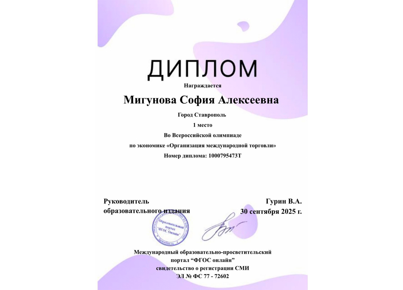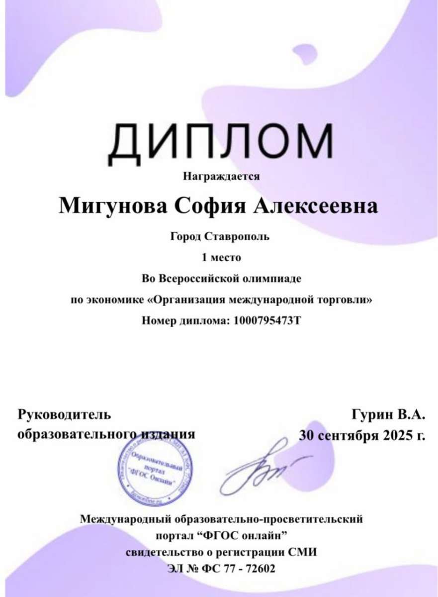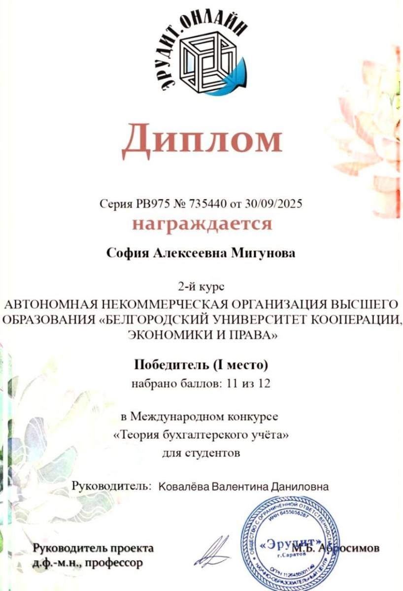 Студентка группы ЭК-С241 Мигунова София одержала сразу две победы: на Всероссийской олимпиаде по экономике «Организация международной торговли» и в Международном конкурсе «Теория бухгалтерского учета». Организаторами состязаний выступили Международный образовательно-просветительский портал «ФГОС онлайн» и научно-образовательный центр «Эрудит».