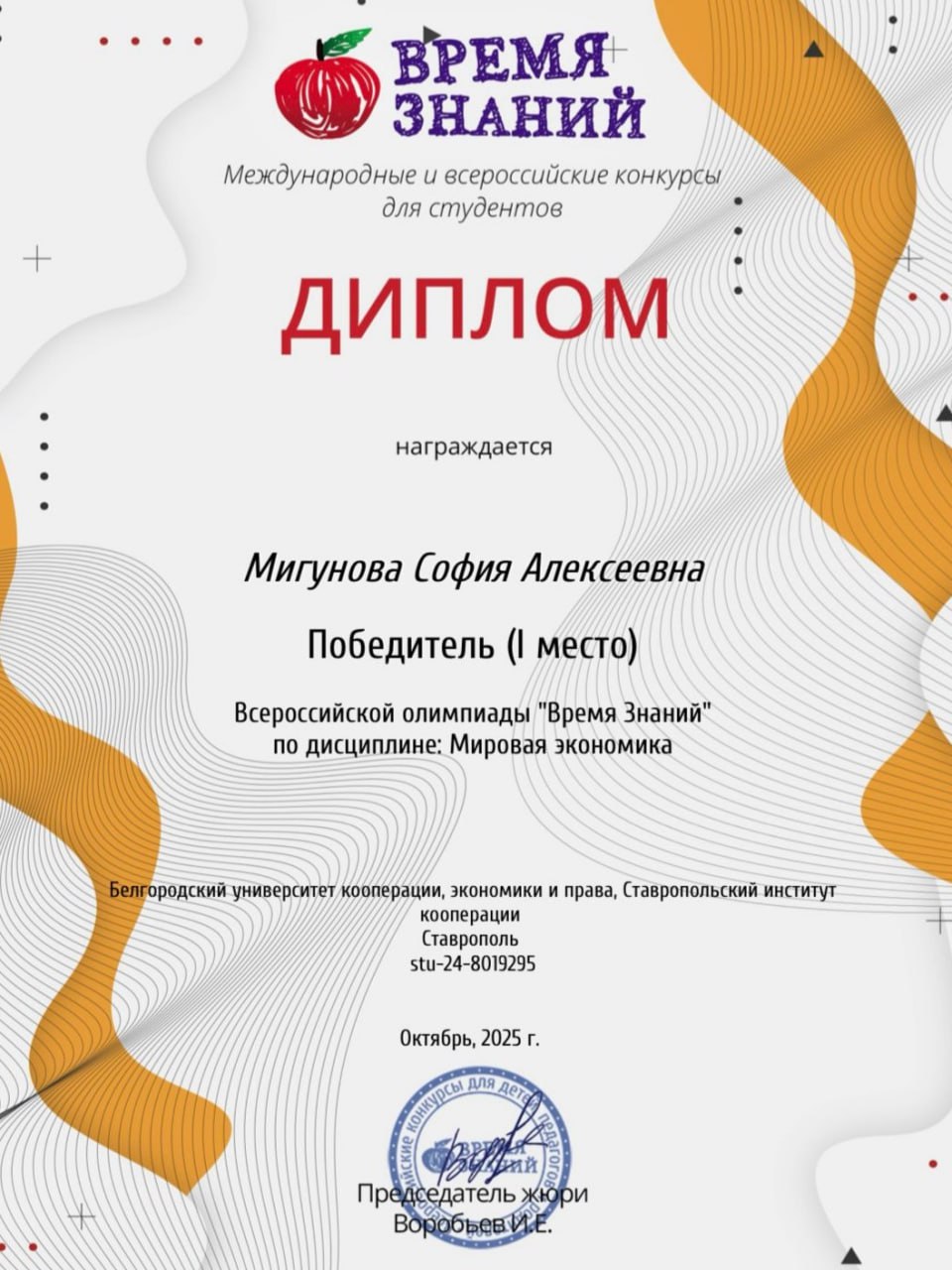 🥇 Студентка финансово-экономического факультета София Мигунова одержала победу во Всероссийской онлайн-олимпиаде по дисциплине: «Мировая экономика».
