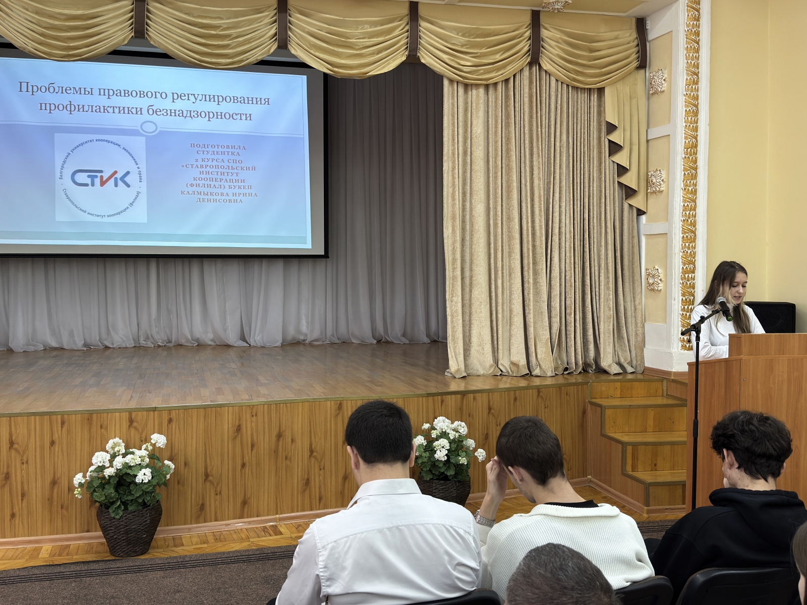 Ирина Калмыкова, студентка Ставропольского института кооперации с докладом «Проблемы правового регулирования профилактики безнадзорности» (научный руководитель — Елена Анатольевна Соловцова, старший преподаватель кафедры государственно-правовых дисциплин Ставропольского института кооперации).