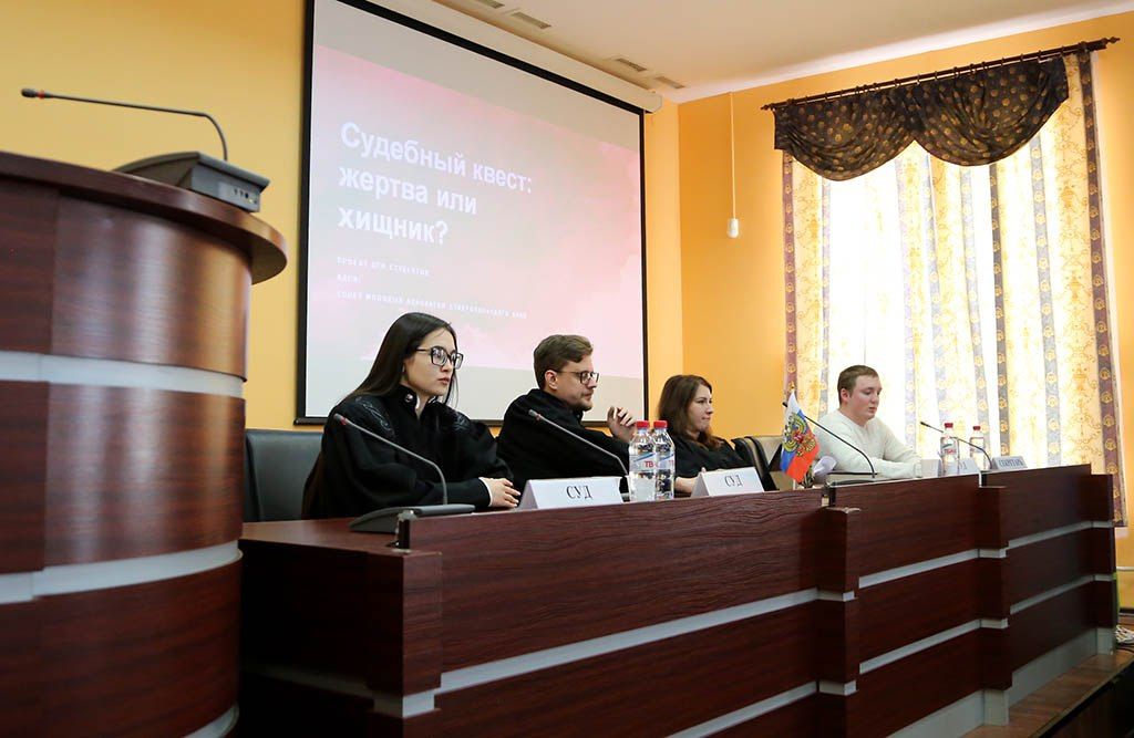 Перед зрителями развернулся судебно-правовой процесс. Теория правоприменительной практики воплотилась в импровизационной постановке, где один из персонажей оказался на скамье подсудимых. Профессиональные адвокаты и студенты продемонстрировали элементы реальной уголовно-процессуальной практики: приемы судебного допроса, публичные выступления, аргументация и диалоги с оппонентом.