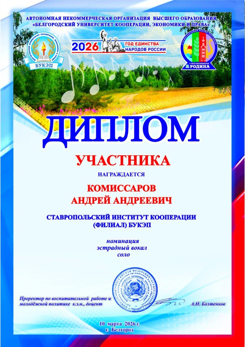 В номинации «Эстрадный вокал (соло)» принял участие студент финансово-экономического факультета Комиссаров Андрей.