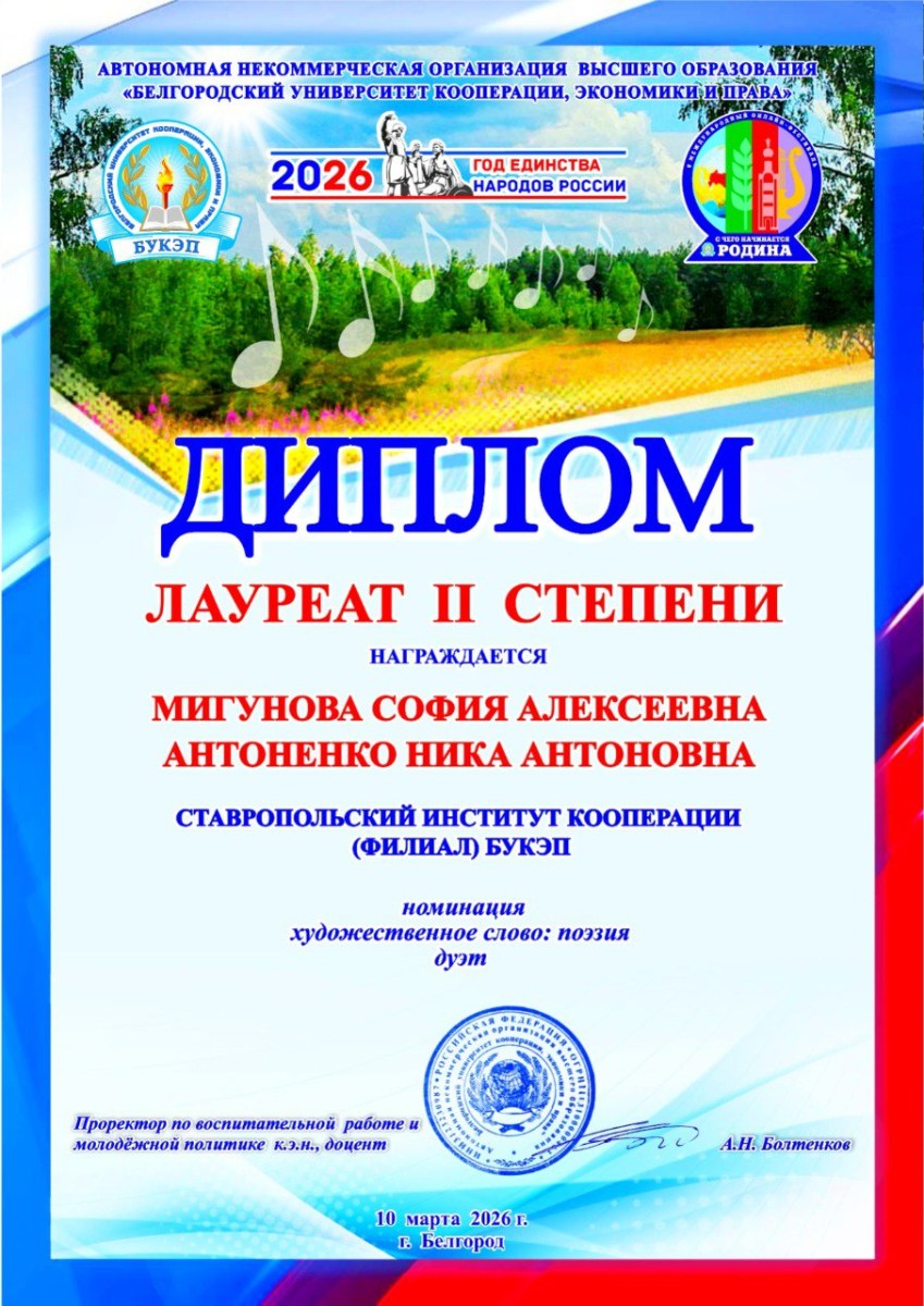 В номинации «Художественное слово поэзия (дуэт)» лауреатами II степени признаны студентка факультета среднего профессионального образования Антоненко Ника и студентка финансово-экономического факультета Мигунова София.