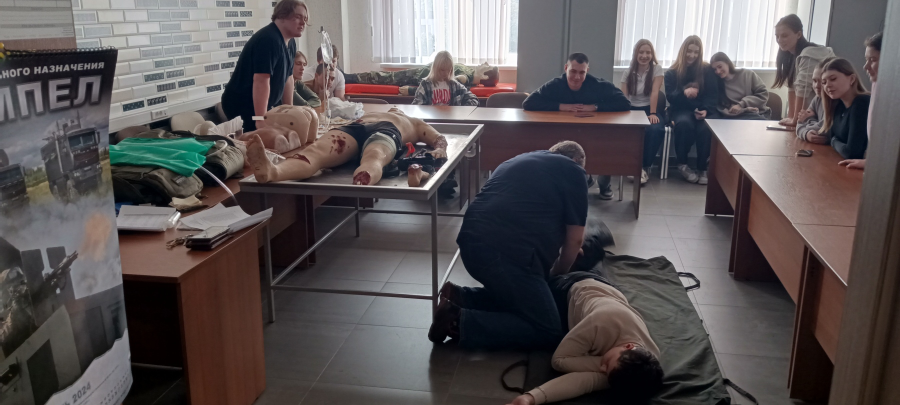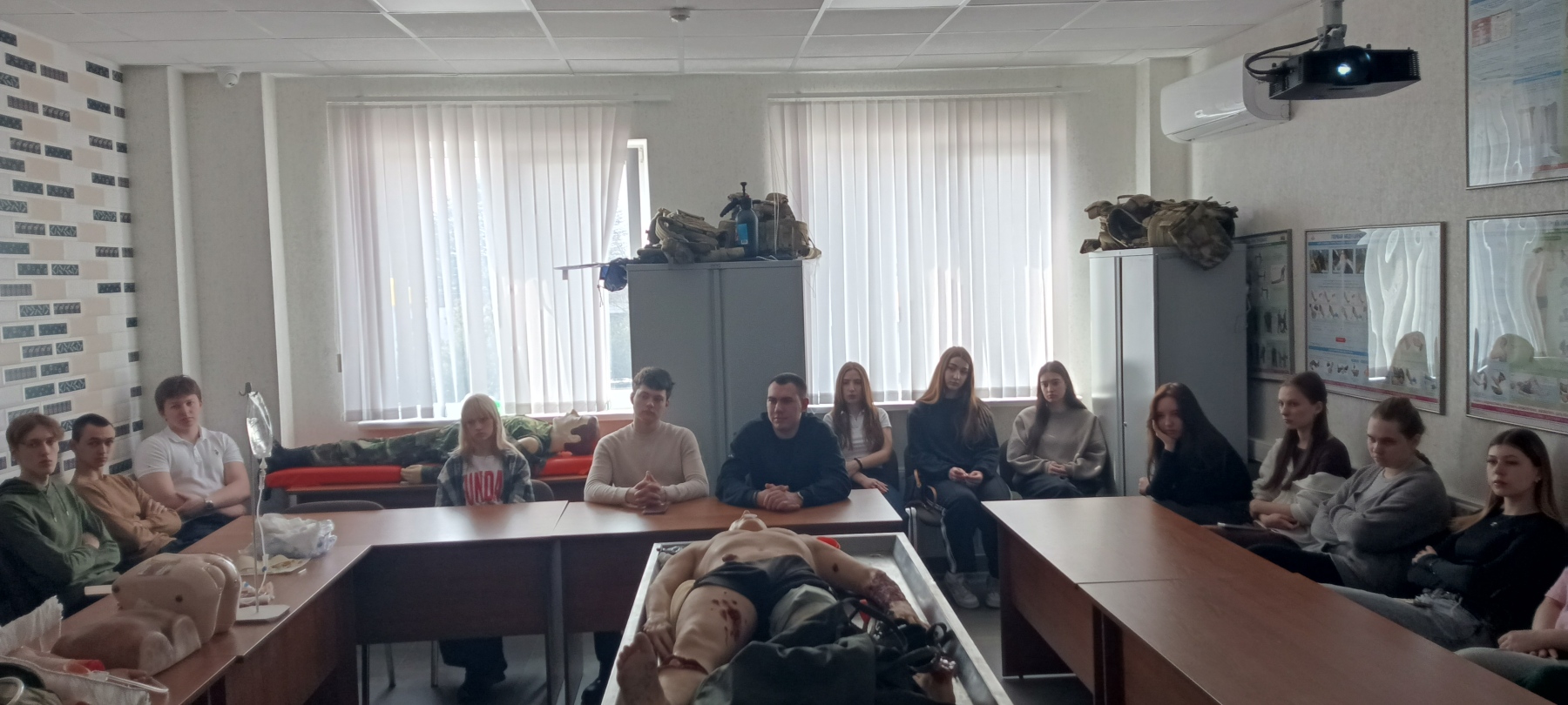 Затем прошел мастер-класс по военно-медицинской подготовке и оказанию первой помощи. На учебном манекене были продемонстрированы различные виды ранений и способы оказания первой помощи.