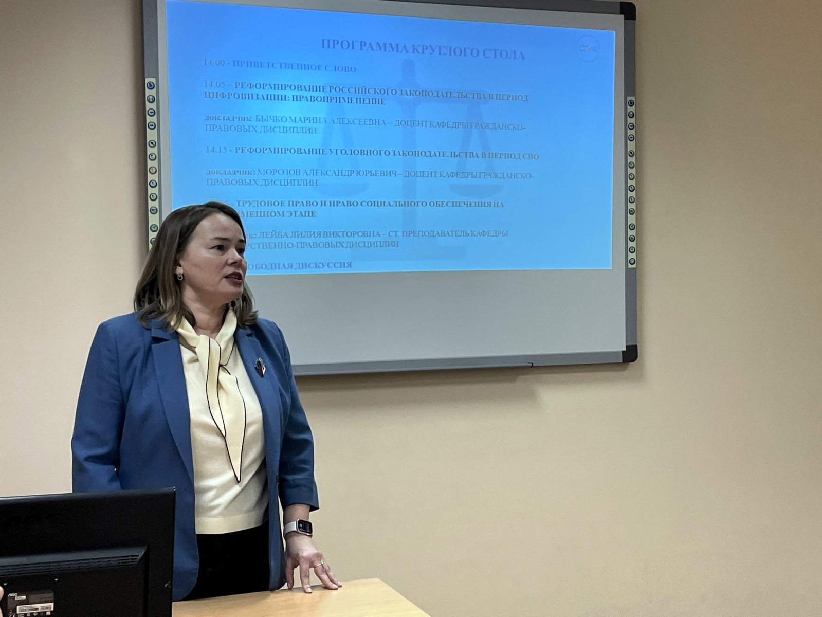 О нововведениях в порядке оформления листков нетрудоспособности проинформировала старший преподаватель кафедры государственно-правовых дисциплин Лилия Викторовна Лейба. Доцент кафедры гражданско-правовых дисциплин Александр Юрьевич Морозов рассказал о влиянии специальной военной операции на реформирование уголовного законодательства.
