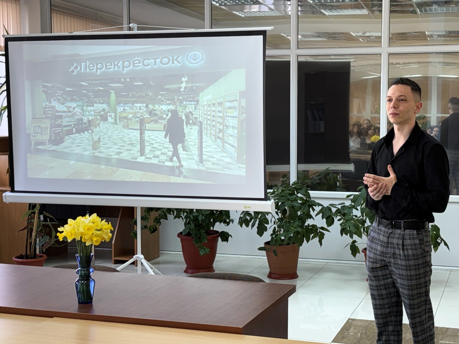 Большой интерес у присутствующих вызвало выступление практического работника: Ильи Сергеевича Коротаева – директора супермаркета АО ТД «Перекрёсток». Илья Сергеевич – выпускник нашего института по направлению подготовки «Технология продукции общественного питания». Он поделился со студентами своим опытом, рассказал о перспективах развития предприятий торговли и общественного питания, о современных проектах, внедряемых на предприятиях.
