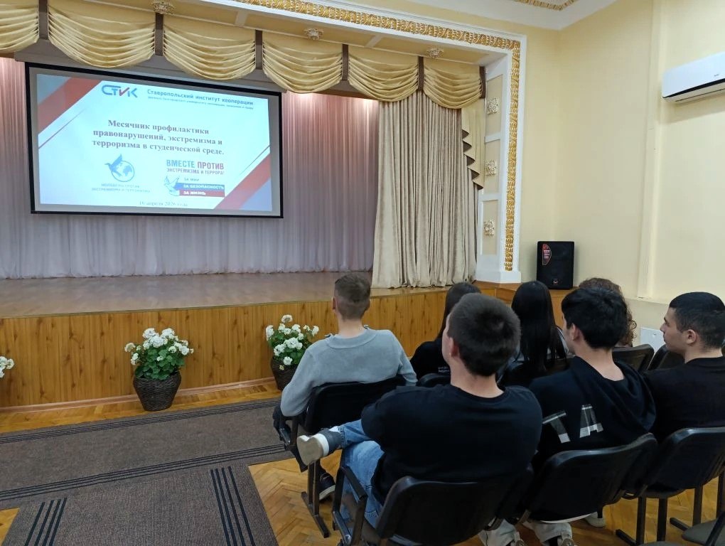 В рамках месячника профилактики правонарушений экстремизма и терроризма в Ставропольском институте кооперации состоялась встреча студентов с представителем Центра противодействия экстремизму и терроризму ГУ МВД России по Ставропольскому краю. Мероприятие было направлено на повышение правовой грамотности молодёжи и предупреждение распространения радикальных идей.